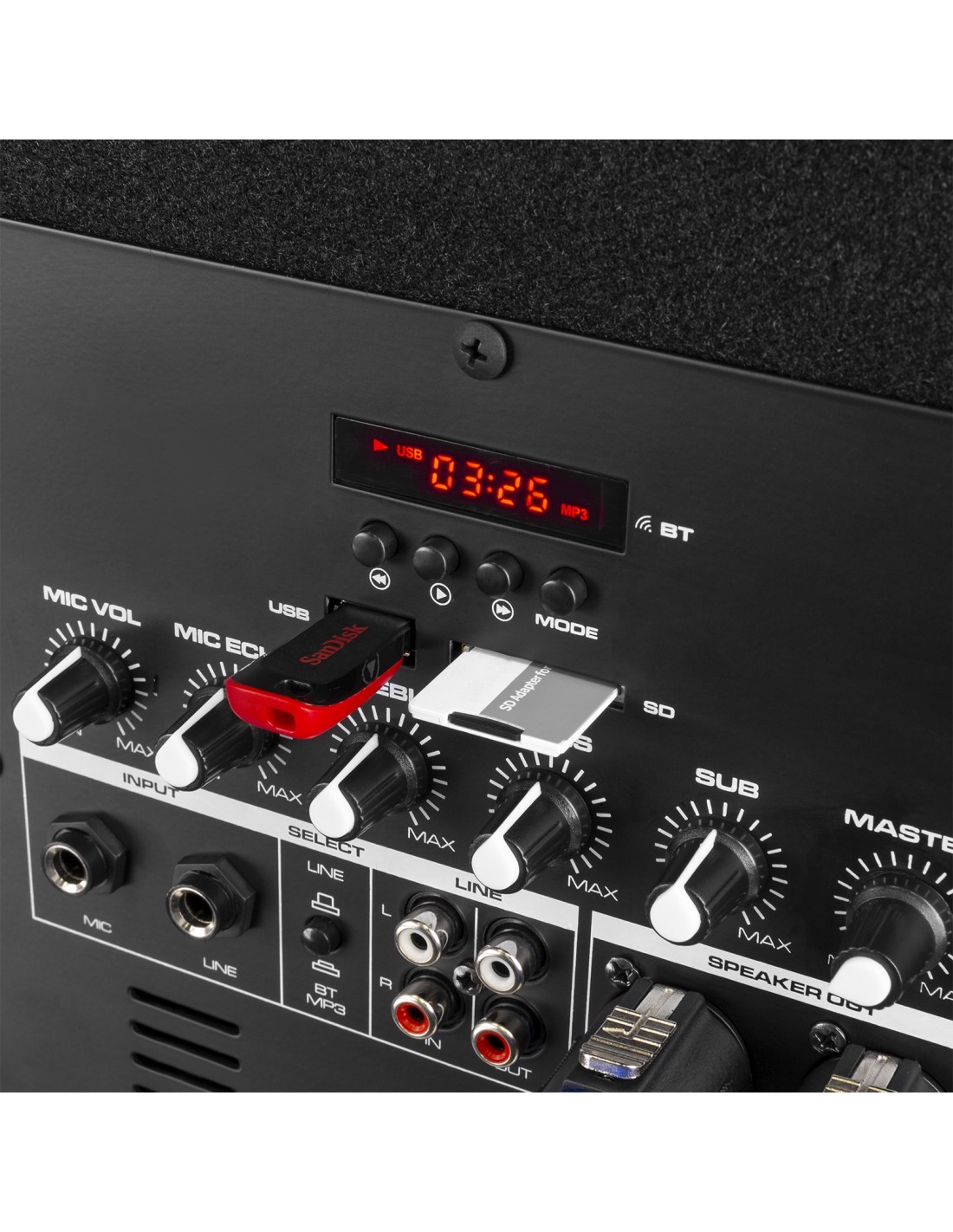 El VX1015BT es un potente juego de altavoces plug & play que ofrece un audio dinámico cristalino en combinación con unos graves potentes. Este conjunto compacto es fácil de configurar y fácil de transportar. Incluye un subwoofer de 15'' y dos altavoces satélite de 10'' con agudos piezo. El receptor BT incorporado le permite simplemente transmitir su música de forma inalámbrica desde su smartphone o puede usar el reproductor de MP3 incorporado con ranuras USB y SD. Este conjunto de altavoces activos es adecuado para DJ móviles, espectáculos de karaoke, espectáculos de autocine, presentaciones, etc.